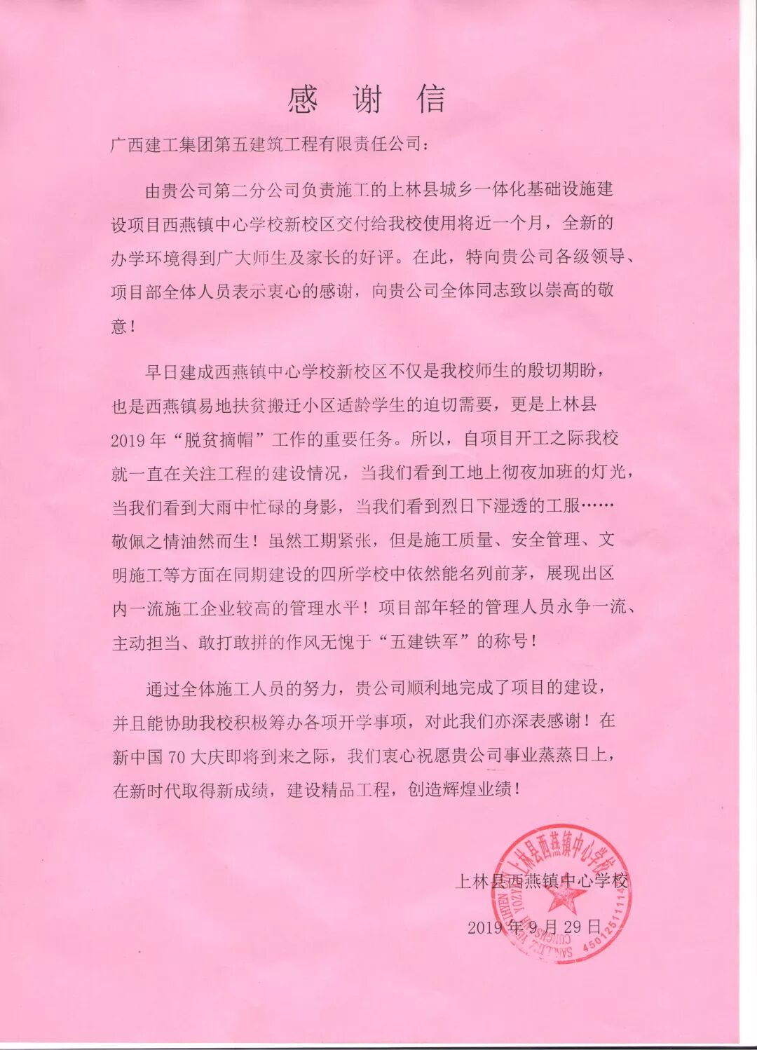 9月29日,二分公司承建的上林县城乡一体化基础设施建设项目西燕镇中心学校工程项目收到一封来自学校的感谢信,上林县西燕镇中心学校在信中对公司和项目团队给予了高度评价和肯定。