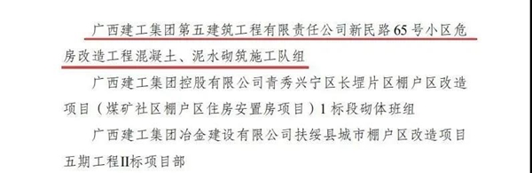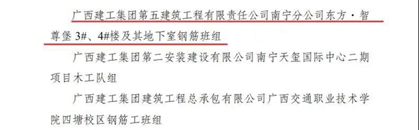近日,从自治区住房城乡建设厅、自治区总工会传来喜讯,在经过全区棚户区改造工程建设示范性劳动和技能竞赛组委会综合衡量、择优选择、考核审定后,南宁分公司东方·智尊堡3#、4#楼及其地下室钢筋班组荣获“2020年全区重点工程建设示范性劳动和技能竞赛优胜班组”荣誉称号;一分公司新民路65号小区危房改造工程混凝土、泥水砌筑施工队组荣获“2020年全区棚户区改造工程建设示范性劳动和技能竞赛优胜班组”荣誉称号。此外,一分公司项目经理刘绍振荣获“2020年全区棚户区改造工程建设示范性劳动和技能竞赛优秀建设者”荣誉称号。