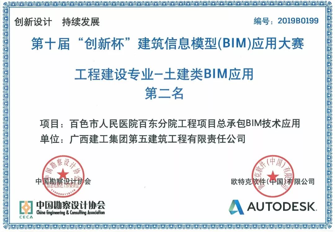 9月9日,由中国勘察设计协会联合欧特克软件(中国)有限公司举办的第十届“创新杯”建筑信息模型(BIM)应用大赛优秀作品发布交流会在广东省珠海市召开,公司百色市人民医院百东分院工程项目总承包BIM技术应用成果荣获工程建设专业—土建类BIM应用第二名。据悉,“创新杯”建筑信息模型(BIM)应用大赛在国内具有较高学术性和权威性。此次比赛共收到有效参赛作品1228个,本着公正、公平、公开原则,组织专家经过初评、网络评审及终评,评选出各类优秀作品共计397个。