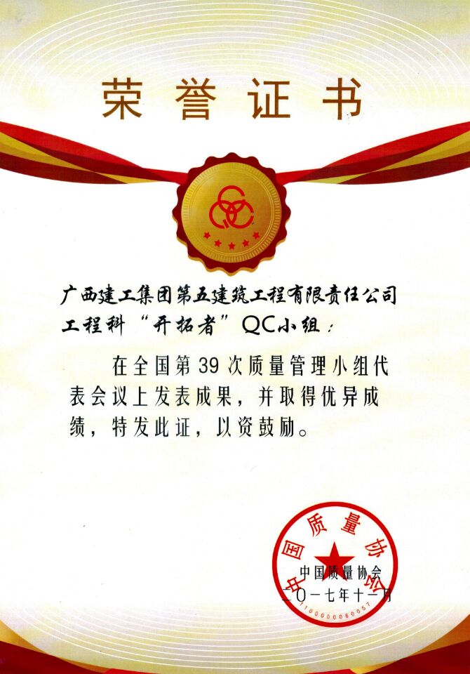 近日,全国第39次质量管理小组代表会议在云南省昆明市胜利召开。由广西质量协会推荐的五公司工程科“开拓者”QC小组创新成果通过激烈的角逐和比拼,从众多参赛小组中脱颖而出,荣获现场QC小组成果发布金奖。