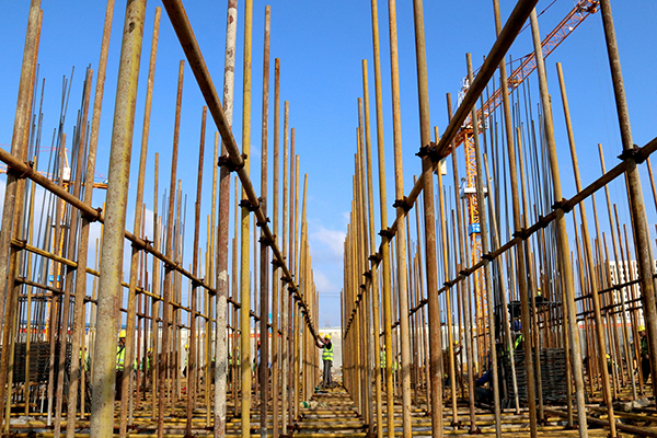在A区地块,受地质异常及地下水过多等情况影响,施工难度加大,经过施工人员昼夜抢工,目前已完成1000多根抗浮锚杆施工,独立基础垫层混凝土浇筑已完成该区域的75%,3块筏板基础混凝土浇筑完工。其中抢在最前头的是A区8号、9号地块,已率先进入满堂脚手架搭设,为A区地下室正负零冲刺开了头。