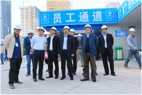 12月5日,广西交通投资集团公司党委书记、董事长周文,副总经理、总工程师、基建办公室主任罗根传以及基建办公室常务副主任罗贤民到交投大厦项目参观和指导工作。同行还有广西建工五建公司董事长、党委书记黄鼎龙,广西建工五建南北分公司党委书记、经理杜福昌,分公司主任工程师李书文。
