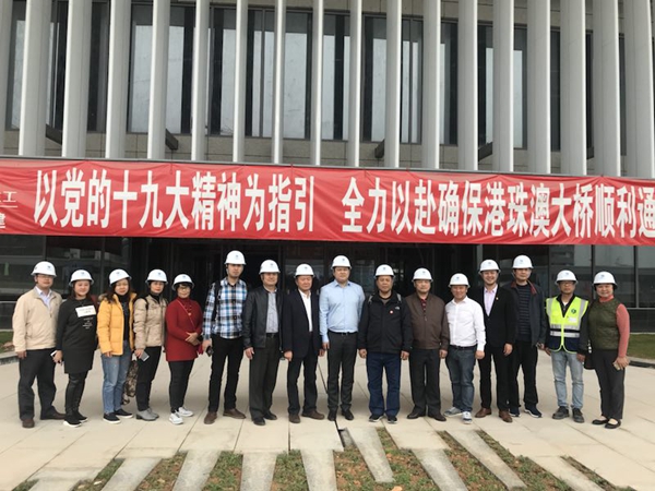 12月15日上午,广西建筑业联合会秘书长韦可奎,南宁市建筑业联合会会长李宗泽一行9人到华南公司承建的港珠澳大桥珠海口岸工程(II标段)参观交流。南宁经营管理部经理李方宇,安全生产管理处副处长孙庆柳、南宁经营管理部党支部副书记蓝青苗、南宁经营管理部副经理魏秉全、工程管理处副处长丁铁军,华南公司副总经理莫坚华,党委副书记、纪委书记、提名工会主席樊丰谋,项目经理莫柳谦等人员陪同。