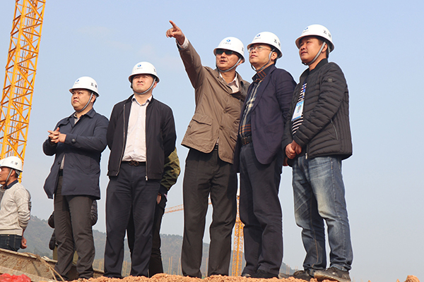 随后,黄鼎龙一行驱车赶往百色饭店项目部,察看了现场作业场面,并听取了项目建设情况汇报。黄鼎龙对百色饭店项目部给予了殷切的期望,他特别强调了两点:一是百色饭店项目是和荔园饭店一样的公建类项目,建成后将作为百色市政府主要接待场所,项目部要高度重视,以鲁班奖的标准来策划、施工;二是百色饭店项目作为EPC项目,总包处在管理位置,如何协调、降低成本、创新课题等摆在面前,希望项目部能够做出一个案例,进行推广。