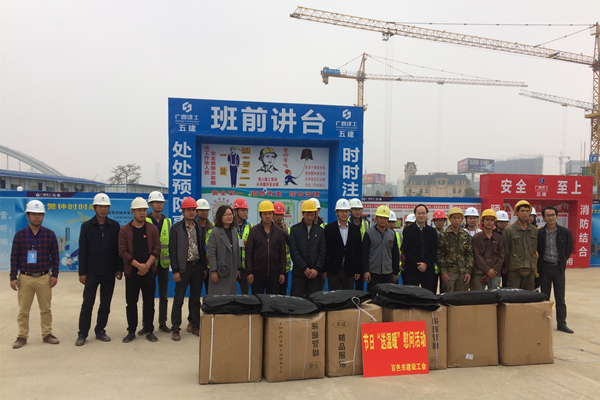 1月24日上午,百色市建设工会慰问组到五分公司百色路桥•锦绣广场项目开展2018年“送温暖”春节慰问活动。百色市建设工会主席邓智斌、副主席李艳、建设工会委员廖文鹤等出席活动。