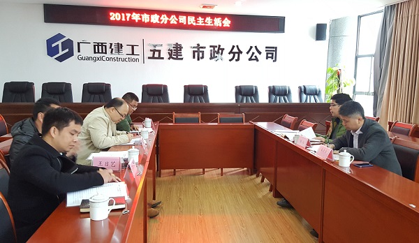 1月31日下午,市政分公司召开2017年度民主生活会,公司副总经理陈永参加并指导会议,公司团委书记毛岳云及分公司领导班子参加会议,会议由分公司经理、党总支副书记谢颖诚主持。