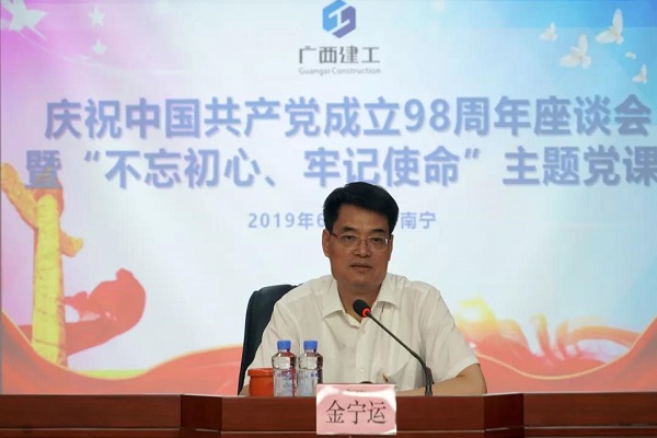 6月28日,广西建工集团有限责任公司纪念建党98周年座谈会暨“不忘初心、牢记使命”主题教育党课在集团公司党委党校举行。集团公司党委书记、董事长金宁运结合近段时间以来的理论学习以及到基层调研的所思所悟,以“守初心、持恒心、强信心,勇担当、促改革、谋发展”为题上党课。集团公司党委副书记、副董事长、总经理罗涛和在家领导班子成员陈家坚、侯立林、李静丹出席。
